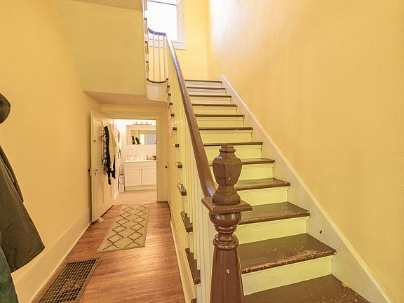 Stepping through the original door with antique twist doorknob and stunning yellow bubbled glass, you will be immediately struck by the soaring ceilings and hardwood floors. On the main floor, you will find the two bathrooms with original cast iron clawfoot tubs, the master bedroom, living room, dining room, spacious kitchen, and laundry area. Climbing the stately stairwell in the foyer will lead you to the two additional bedrooms upstairs which, like most of the other main rooms in the house, feature ornamental fireplaces.