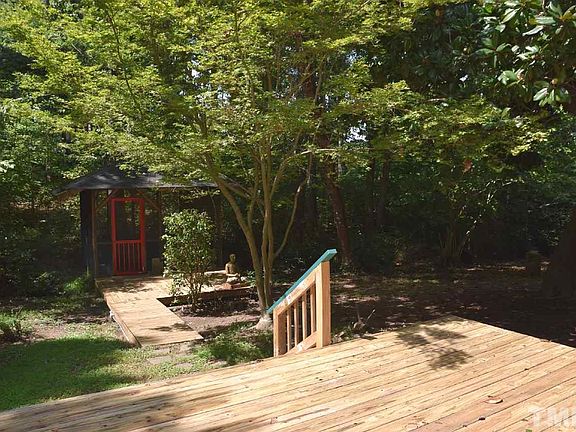 Available 10/12. West Raleigh 1 story home with 2 bedrooms and office PLUS 16' X 27' garage with 350 sq.ft. workshop. Hardwoods throughout. Kitchen includes huge butcher block bar, tons of cabinets and pantry. Rear door opens to private backyard with deck and elevated walkway leading to 14' X 11.5' screened in gazebo with wooded views. Master bedroom includes customized storage and door to another rear deck. Easy access to Downtown Raleigh, NCSU and Vet School. 1 adult pet 50 lbs with $300 pet fee