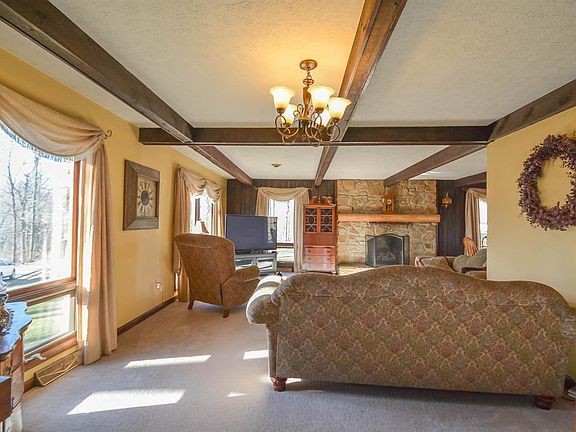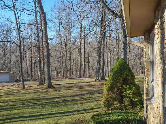 This adorable rustic home on 2.1 acre site is near the Lawrence/Monroe County line near the Salt Creek Brewery. This home on lovely wooded acreage has a park like setting with a restful setting. This well maintained home has gorgeous brown county stone fireplace, three bedrooms, three full bathrooms, an attached two car garage, plus a detached 1 1/2 car garage. This tidy home has warm wood accents and coffered ceilings and parquet flooring. The large lower level recreation area has access to the large dedicated laundry area. Entertain big groups in this home with fantastic great room and kitchen combo.