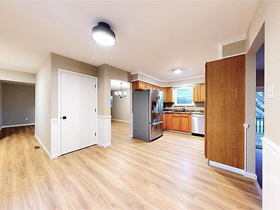 **MOVE IN READY** Beautiful, over 1,500 sq ft Ranch home in excellent location to schools, parks, highways, and more! NEW Paint, New Gorgeous Hard Surface Flooring, New Carpeting, and New Fixtures throughout! Plenty of room for entertaining, working, or schooling with 2 separate living areas, including a sunken family room with brick fireplace and walk out slider, full living room, eat in Kitchen, separate Dining Room, and Main Floor Laundry! Stainless appliances in the kitchen with eat in breakfast room (including newer side by side refrigerator), double deep sink, upgraded dishwasher, wainscoting and crown molding! Main floor primary suite features a large walk in closet and full bath with walk in shower! DRY Lower level has some framing and some finishes, but mostly wide open for your finishing touches! Lots of opportunity with the oversized, fenced back yard and deck with HUGE retractable awning!! Newer windows, slider, siding, & HVAC system! Some Accessible Features
