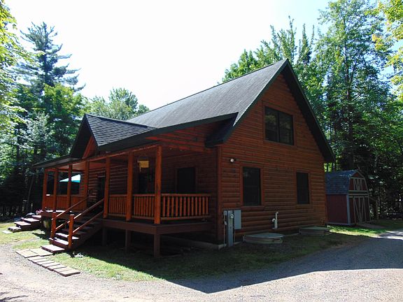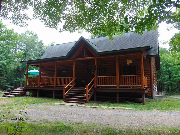 Beautiful 5BR 3BA custom built Golden Eagle Log home with 24x36 two car detached garage nestled on 3 secluded wooded acres surrounded by the Ottawa National Forest and many inland lakes located in northern Iron County! This home and property needs to be seen to be appreciated and has so much to offer! The main level features a nice entry with closet leading to a huge open living/dining/kitchen area with cathedral ceilings and plenty of large windows offering loads of natural sunlight! You'll enjoy the floor to ceiling stone fireplace in the living room on those chilly nights. There are sliding glass doors off the dining area leading to the cover screened in porch and huge wrap around deck perfect for entertaining guest or enjoying your morning coffee to the sounds of nature. The rest of the main level feature two bedrooms and a full bath. The upper\loft area has an open sitting area overlooking the living/dining room, a bedroom and half bath. The lower level features a huge open family/rec room with bar, two bedrooms, full bath, laundry room and utility room. The owner has recently put new flooring down in the lower level. The newer garage built in 2022 is insulated, heated and has a unique automatic pully system staircase for entering the loft for addition storage along with two lean-tos perfect for storing your boat or tractor. The owner has made his own dust collector system that will also stay. There is an additional storage shed for storing your lawn furniture or lawn mowers, etc... The hunting and fishing in the area is proven to be outstanding and there is so much Ottawa National Forest to hike and explore and along with having the snowmobile and atv trails close by. If privacy is high on your priority list, along with having an absolutely beautiful log home with lots of storage in the middle of God's Country, you'll definitely want to check this one out! Call for an appointment today!