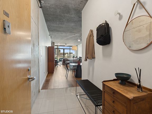 Urban Elegance at Lofthaus! Nestled in the heart of the West Loop, this stunning +900 SF condo offers a perfect blend of immaculate condition, ideal location and picture perfect HOME. Step inside the spacious unit featuring high concrete ceilings and open western exposure that bathes the space in natural light and you are immediately at ease. From the ground up: designer-owner replaced flooring, adding tile foyer connecting into warm, wide plank wood laminate floors. The renovated kitchen is a chef's delight, boasting an eat-in design with new LG appliances ( still under warranty), expertly painted cabinets and ample counter space for culinary creations. Invite friends over and awe around the dining room table or take them outside for dining al fresco. There is room for everyone in this welcoming space. The living area is accentuated by floor-to-ceiling windows, complete with roller shade window treatments, a working fireplace with newer, masculine tile surround that adds warmth and ambiance. Owner has WFH set up which could be moved to multiple locations in the home. The bedroom is a sanctuary of comfort, offering a custom closet and a walk-in custom closet. Wired for wall mount tv and offering operable windows. The bathroom is a luxurious retreat with a soaking tub, perfect for unwinding after a long day. 2023 Washer Dryer is a must see too! Additional features include a building intercom security system, common storage, and garage parking. The building offers the ease of an elevator, making access a breeze. All a block from Bartelme Park ( green market in summers), and lucky friends can find parking for free nearby. This newer condo is a rare find, combining style, comfort, and convenience in one of Chicago's most desirable locations. Don't miss the opportunity to make this exquisite residence your new home! Beyond move-in ready.