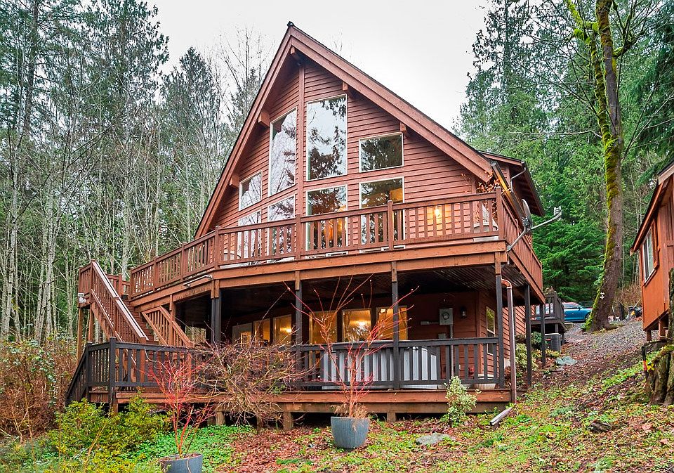 {PEACE & TRANQUILITY} Stunning A-Frame with views of Lake Roesiger, access to 40ft of low bank waterfront, mere steps to the beach. Open concept living space with spacious kitchen, sun-filled Living room, and a wall of windows. Sitting on shy of 2 ACRES. 1 BED + 2.5 BATHS + 3 BED SEPTIC + BEACH ACCESS WITH DOCK & CABIN ON BIG LAKE; shared with 2 neighboring lots. Possibility to build your dream shop with MIL - Buyer to verify. ENDLESS POSSIBILITIES WITH YOUR LAKE PROPERTY HOME