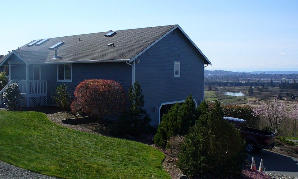 This home has the most expansive unobstructed views in E Evt/w Lk Stevens. Upon entering you will be struck by the extraordinary bright interior (5 skylights) that leads to 8' high view windows that overlook Puget Sound, Snohomish river, sloughs, and the city of Everett. New Hardie plank siding, a full length entertainment deck constructed of trex decking, granite slab kitchen counters with island, expansive oak flooring, wood wrapped windows, and much more on a private dead end street.