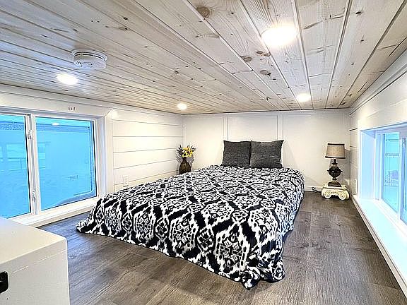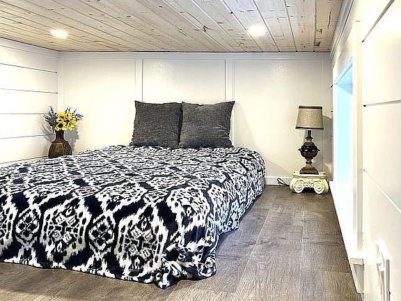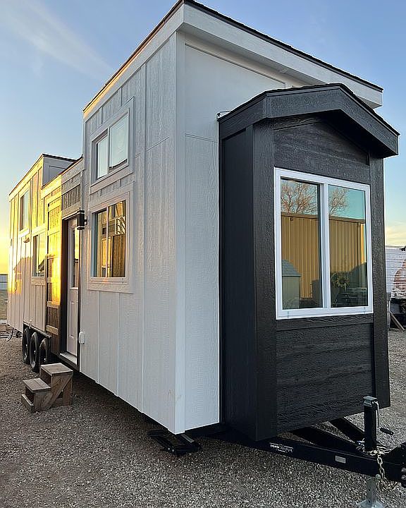Large format luxury Brand New 260 sq ft Tiny House NOAH Certified! All Appliances Included! Oversized loft accessed by stairs with metal raining Built in bench with extra storage underneath Beautiful clean kitchen with plenty of panty storage under the stairs and floating shelves Dining room has a foldable table & chandelier! Extra shelving in the Living Area Extra storage closet in the bathroom Pine Wood Stained Ceiling Smart Panel Siding Vinyl Windows 50 amp Hook ups Designed to carry a snow load in colder temperatures General Details Approximate Weight:16,000 lbs The Width: 8.5 Feet Wide Length: 28 Feet Long Total Lofts:1 Loft Registered With Plates Title In Hand NOAH Certified Ground to Roof Height: 13.4 Feet Dining Table & Seating: Dining Table Included Only Lighting Details: Energy Efficient LED Recessed Lighting Interior Wall Details: 1 x 8 MDF Shiplap Flooring Details: Waterproof LVP Flooring Countertop & Cabinet Details: Butcher Block Countertop, Shelves, and White Shaker Panel Soft-Close Cabinets Sewer and Water Hookups Details: Standard RV Bathroom Vent Details: Included Shower or Tub Details: 36in Fiberglass Shower Other Appliances Included: Greystone Range Hood. Rinnai Tankless Propane Water Heater Washer & Dryer Details: Full Size Electric Stackable Washer and Dryer Kitchen Sink Details: 24in Stainless Steel Sink Stove & Exhaust Vent Details: Propane 3 Burner Cooktop with Oven Refrigerator Details: Vissani Refrigerator and Freezer (24in x 5ft) Structure Framing Material Details: 2x4 Sheet with OSB Fiber and Siding Panels Roof Material Details: Asphalt Shingle Roof Insulation & R-Value: Ceiling: R30 with 3in Spray Foam | Walls: R15 | Floors: R30 | Finished with Blow in Fiberglass Toilet Type: A Traditional Flushing Toilet Additional Information Trailer Brand & Hitch Size: Iron Eagle Trailer & 2.25 Hitch Mini Split AC/Heat Included Trailer Brake Lights Function With Electric Brakes Included 4 Stabilizer Leveling Scissor Jacks Included