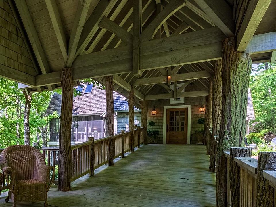 Privately situated at the end of a quiet cul de sac, this charming mountain home's lot has over 400 feet of frontage on Tom Fazio's award winning Wade Hampton Golf Course's #3 par 3, and from its elevated perch overlooks the southern section of the course with distant mountains as backdrop. View orientation is slightly west of due south. Beautiful boulder gardens and a magical covered bridge over small springs and creeks greet you and deliver you to this sophisticated "treehouse." Beautiful doors, beamwork, indigenous stone fireplaces are all present in this home. The large Carolina Room takes advantage of the views and offers a wood burning fireplace to take the evening chill off. There are three great options for dining areas- one tucked away in a private room setting with terraced gardens as backdrop, one off the kitchen and one in the large Carolina Room. The Primary bedroom with outstanding views and tray ceiling is on the main level with a small office/closet combo and recently updated bathroom featuring marble tile, twin sinks and tub. Downstairs features a small guest den easily accessible by all three guest suites. There are 2 wood burning fireplaces on the main level and one gas fireplace in the lower level common area. The guest bedrooms are large and nicely separated for privacy, and each offers wonderful golf and mountain views and private bathrooms. New carpet, new interior paint, substantial repairs and upgrades to HVAC, plumbing, drainage and insulation, new stack washer and dryer. This beautiful home has been lovingly updated and maintained.