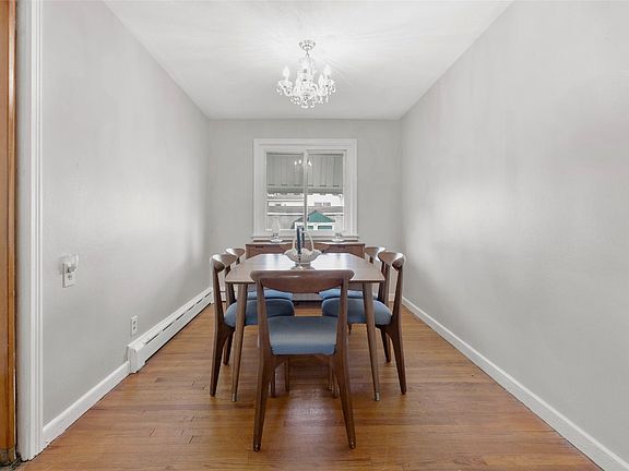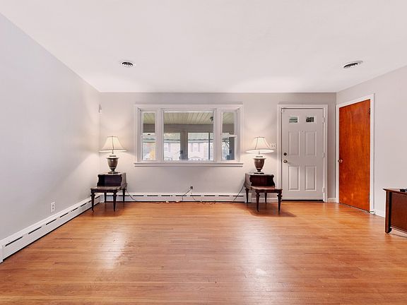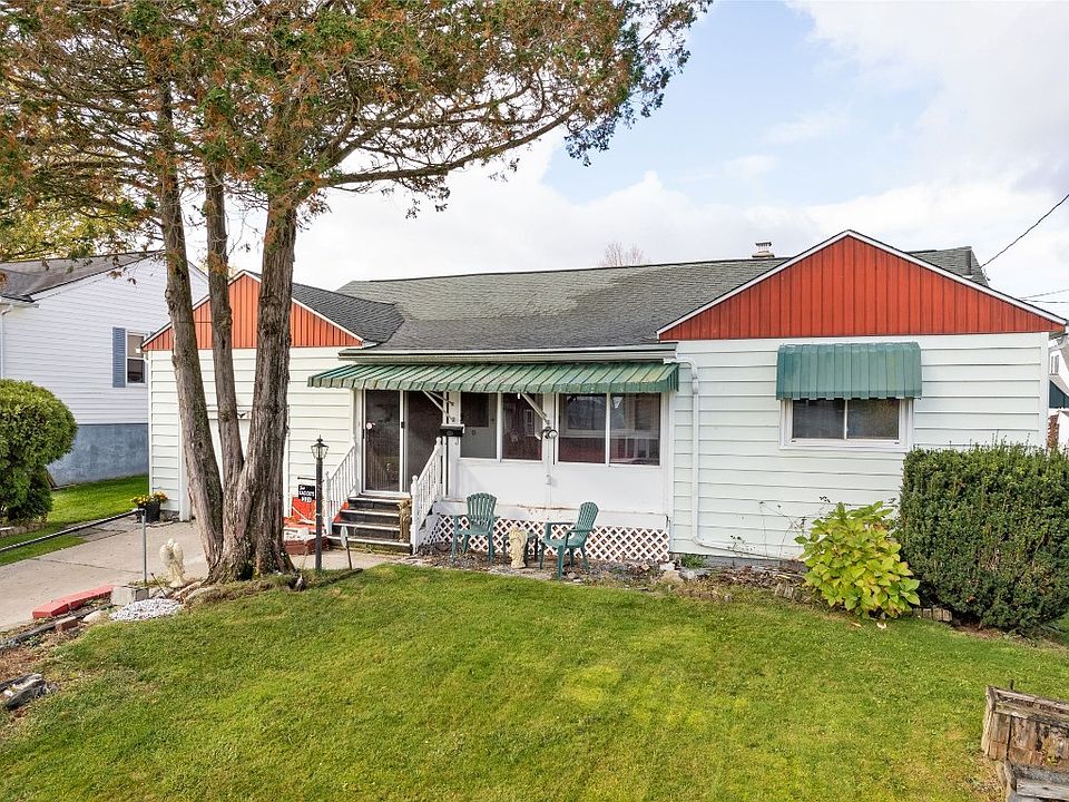 Ready to downsize? Want an attached garage? How about a flat level fenced in backyard? This 1952 ranch has all the period details you'd expect. Hardwood floors in living, dining, hall, and both bedrooms. Replacement windows. Enclosed front porch. Three season room off kitchen. Screened porch off three season room. Kitchen is a great size with room for a table or center island can be added. The roof was replaced within the last 10 years. There are large closets in both bedrooms. Basement has some finished spaces (circa 1968) with a tiled bathroom with a stall shower in need of updating, but functional. Fireplace in basment ornamental only. Dishwasher does not work. House has hotwater baseboard heat (boiler in basement) and an air handler in attic for central air.