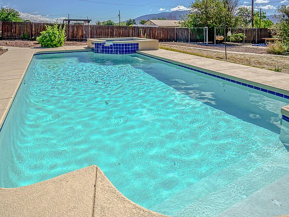 Rio Rancho Stunner! Spacious one story home with sparkling pool and lush gardens. You are welcomed by a gracious front entry with a bubbling fountain. Large living room with fireplace. Roomy kitchen with breakfast nook. 4 bedrooms and 2 baths on one level. Outside is perfect for entertaining with an inviting saltwater pool and hot tub, covered patio and detached studio. Make this your home.