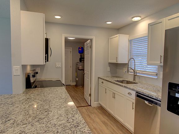 Available now. Completely updated 4 bed, 2 bath home with large fenced backyard is ready for immediate occupancy. New lighting throughout, including recessed ceiling, fans and fixtures, illuminate the freshly painted walls and new easy-care flooring. The kitchen features all new appliances, granite counters, sink, faucet and so much more. The breakfast bar opens to the main living area while the dining area boasts backyard views through double sliders. Both bathrooms boast new sinks, tile and toilets. Spacious master bedroom has private bath. Extra-long single car garage has direct access into the home through the spacious laundry room. Hurry, this incredible rental with not last!