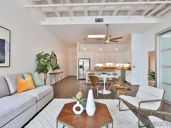 Great opportunity to own in the historic former FBI Headquarter building – converted into upscale urban living! This top floor unit has just what the sophisticated buyer is looking for! Spectacular style with soaring exposed concrete ceilings, multiple skylights, updated kitchen, 1 full bathroom + powder room & offers southern exposure with balcony views to Balboa Park & to the west. The bedroom has a built in tv/movie projector & retractable screen for movie nights in bed! Full size laundry, home office area, Central Heat & AC & that amazing open concept living you’d expect in loft style living. 2 wide (non-side by side) underground parking spaces + private storage cage. HOA Roof assessment have been paid in full by owner.