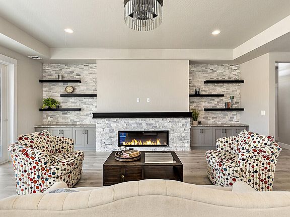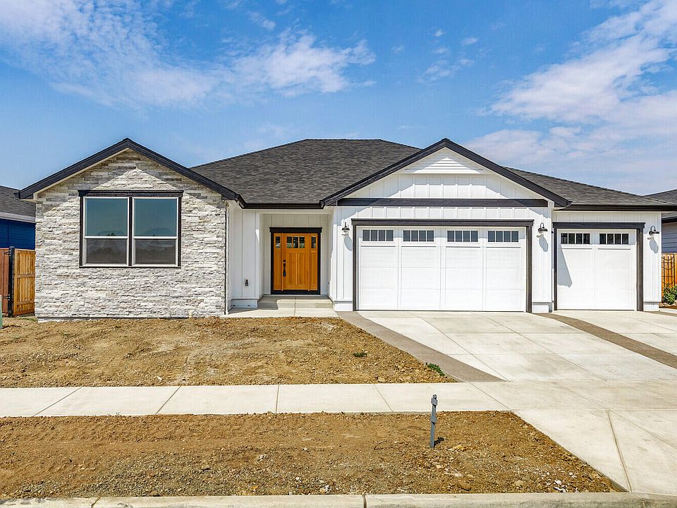 Welcome to Cedar Landing! This is your chance to own a brand new, farm-style home that is ready for you and your family to move in now. This home has been upgraded with LVP & tile flooring, vaulted ceilings in the guest room, wide hallways & an oversized utility room with tons of storage. The open gourmet kitchen features leathered granite countertops, painted cabinets and a pantry - perfect for any entertainer. The master suite comes complete with an exquisite ensuite bathroom with coffee station area; plus there's a stunning walk in tiled shower sure to be the show stopper of this house! Don't forget about the oversized walk-in closet. In the living area you'll find an elegant rock backdrop behind a 5' linear fireplace as well as built-in cabinetry & shelving. 12' slider lends to plenty of light and opens to covered patio. The yard is huge and is the perfect blank slate to create a paradise with backdrop of RoxyAnn. Finally, this property offers a 3 car garage for all your cars