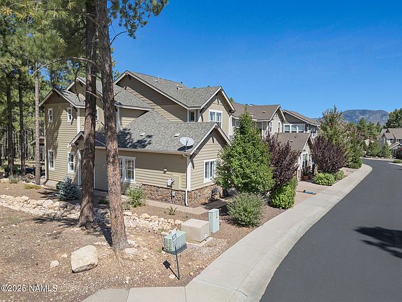 An exceptional gem and rare opportunity, this IMMACULATE townhome sits on what may be the BEST lot in all of Pinnacle Pines. Pride of ownership boasts throughout. Expansive windows bathe every room in natural light, beautifully complemented by elegant plantation shutters. In the winter months, relax by the cozy gas fireplace, upgraded with both a thermostat and blower for effortless comfort. The kitchen is a true highlight, featuring stunning granite countertops paired with finely crafted dovetail, soft-close cabinetry. The MAIN LEVEL primary suite offers tranquil views of the towering ponderosa pines, while the en-suite bath provides dual vanities, a walk-in shower, and a dedicated makeup station. Upstairs, you'll find two spacious bedrooms and a versatile bonus room, perfect as a secondary entertainment space or potential fourth bedroom. Step outside and be captivated by the private backyard retreat, complete with paver patio and unobstructed National Forest views. All this, just minutes from Flagstaff's best dining, shopping, and entertainment. Whether a primary residence or vacation getaway, this home offers the perfect blend of comfort, convenience, and timeless appeal.