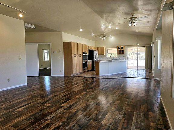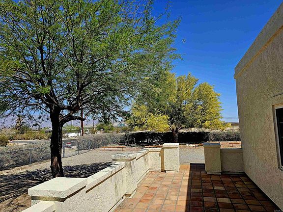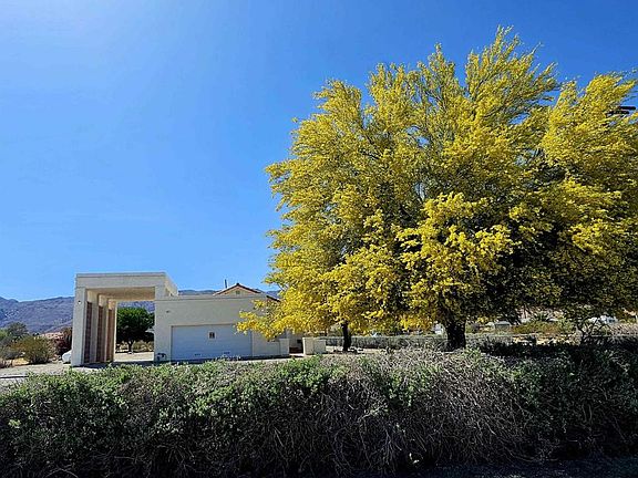 Looking for a warm winter getaway? Welcome to this fully fenced half-acre lot with a two-bedroom, one-bath move-in ready home complete with an outdoor screened room and covered RV parking for your friends. The home stays very temperate and has dual-pane windows, ceiling fans throughout, newer flooring, stainless steel appliances, dual ovens, a large center island with a cooktop, and a great room. The garage has access to a flat roof with railing to utilize as a sun deck, washer/dryer hookups, and an insulated garage door. Come enjoy the desert culture of metal art, intricate shops, golf courses, hiking, riding, artist displays, starry nights, and more.
