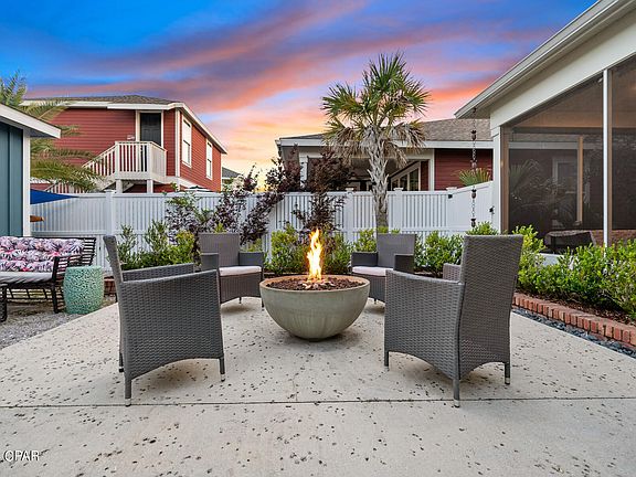 The outdoor space is a private oasis in and of itself. Sit and enjoy a cup of coffee watching the sunrise from the screened-in lanai or gather by the gas fire pit on a cozy winter night. The property is complete with a white privacy fence and a detached 2-car garage.