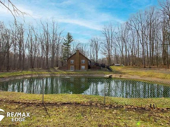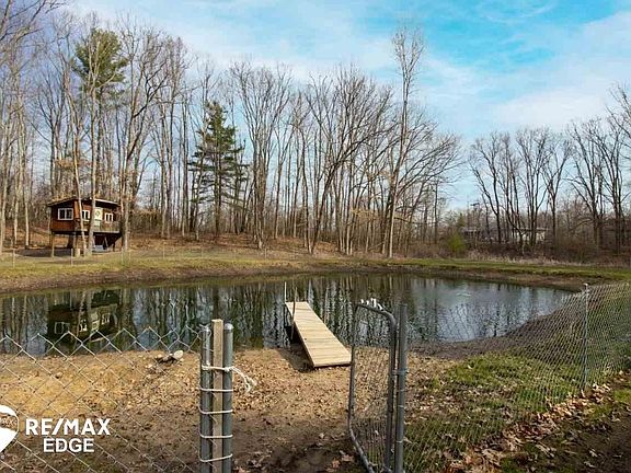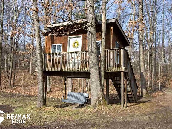 Secluded 4.89 wooded acres with trails & a beautiful pond for swimming or fishing. Pond is stocked with bluegill, bass, catfish& goldfish. Ultimate tree house for kids or adults. Gorgeous ranch features an open floor plan with amazing views. Great room with wood floors, gas fireplace that is accented with a stone back drop and custom wood mantle. Island kitchen that includes the stainless steel appliances. Large dining room for entertaining. Remodeled full bath. Primary bedroom with a full bath. Lower level walkout with custom wood paneled walls and wood burning fireplace that heats the whole house. Large deck off the back of the house. Detached 2 car garage. Hunting tree stands are excluded.