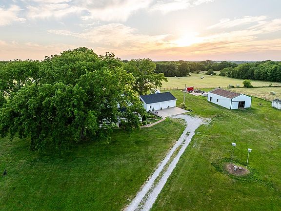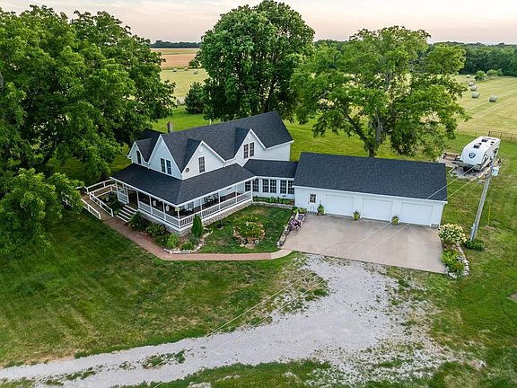 Located southeast of Butler on blacktop State Route O is this stunningly elegant home and acreage. Constructed over a century ago, the home has been completely remodeled, and retains its historic charm while featuring tasteful modern amenities and finishes. With three bedrooms and two full baths, the two-story home is estimated to be approximately 2,500 square feet. The main floor contains the sprawling kitchen, family room, and dining room. An addition to the first level that was once a sunroom now showcases a gorgeous guest bedroom with vaulted ceiling, and the main level bathroom, both flooded with natural light. The unique second story floor plan features what is currently the master suite with a view, a second bedroom, a common space, and Jack-&-Jill full bathroom. Another addition was the oversized three-car garage and large breezeway that connects it to the home. Classic features of the house include the wrap-around covered porch, fluted wood casing and trim, the refinished freestanding oversized tub, and two staircases at opposite ends of the home. Along with the trim, premium interior finishes include hardwood on the main floor, tile bathrooms, carpet in the upper level bedrooms, quartz countertops and backsplashes, beautiful oak cabinets, and 2” wood blinds. The exterior reflects the same standard as the rest of the property, with James Hardie siding, newer roof, 6” gutters with leaf guards, and gorgeous landscaping. The original stone-foundation cellar is well-maintained and clean. North of the home is a 28x50 barn that has power and lights. Additional improvements include two concrete pads; one with RV power hookup.