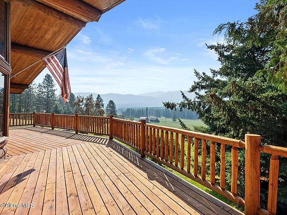 Sweeping panoramic views of the Cabinet Mountains and Kootenai River valley take your breath away from this well-groomed horse farm in Bonners Ferry, Idaho. A new $9,000 Seller Credit to Buyer for new flooring of their choice makes this picturesque spot even sweeter. With logs sourced from and hand peeled in Boundary County, this home rests along a gently sloping hillside, with loads of Southern exposure and just enough shade from mature trees near the house. Steps away sits the barn with partially finished bunkhouse, a separate hay storage barn and 70x100 round pen arena. Fully fenced pastures are already in place, with plenty of land to spare for gardens and more. Take in the panoramic beauty from the inside too, with abundant windows, spacious rooms and a fully finished basement. Enjoy main level living with primary bedroom, full bath, living area, laundry and sprawling outdoor deck. Downstairs you'll find two more bedrooms, bathroom, mud room, root cellar and complete in-house gym Thoughtful updates throughout, including generator, security system, new roof last year and so much more.