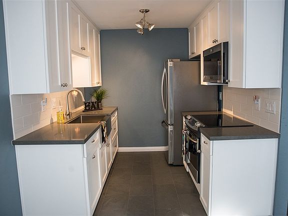 You will fall in love with this immaculate, sophisticated condo. Kitchen features classic white cabinets, quartz countertops, top of the line SS GE profile appliances & Kraus SS apron sink. Upgraded lighting throughout, wood flooring and slate tile. Bath rm was just remodeled European style subway tile tub/shower. Large closet in hallway & EX-Large closet in Master. Private patio looking over courtyard/pool area. End unit. Close to laundry. Gated and full size garage & storage w/ keyless entry.