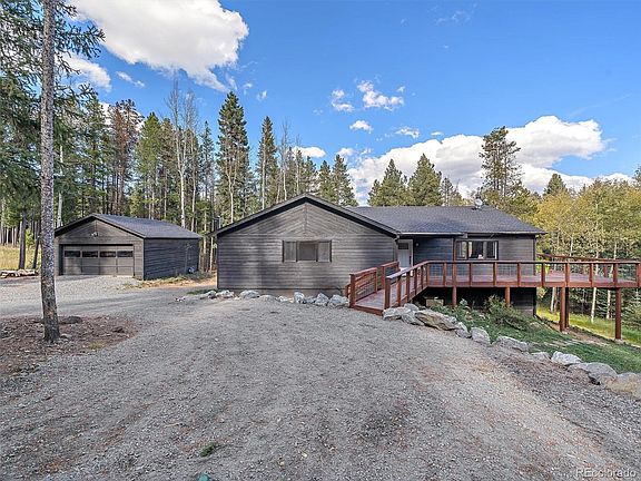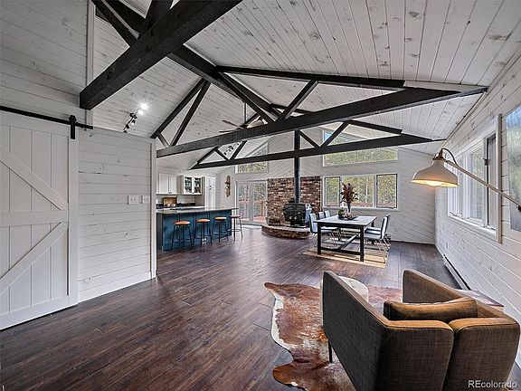 Remodeled to perfection! Sitting on a 2.20 private and pristine acres, this 5 bedroom, 3 bath mountain contemporary will impress from the minute you arrive. The new redwood deck leads you to the entry and the bright and open main floor. New, spotless hardwood floors are complemented by the vaulted whitewashed T&G ceilings with beam accents and expansive windows that fill this home with natural light. The remodeled farmhouse kitchen will delight. Featuring custom cabinetry, beautiful quartz countertops, new stainless steel appliances, large island, breakfast bar and designer fixtures. The kitchen looks onto the open dining area and wonderful wood stove that will keep you toasty on the coldest days. The primary bedroom boasts a walk-in closet and gorgeous remodeled bath. Plus, two more bright bedrooms and a remodeled full bath, complete the main level. The walk-out lower level has new carpet, a second cozy wood stove, living room, two more bedrooms, office, big laundry room and the third remodeled bath! Other features include the detached two car garage and circle driveway. Plus a bonus building with lots of possibilities. Located on Conifer Mountain. All paved and country-maintained roads. Just 13 minutes from Hwy 285. Peaceful and quiet, this one is a must see! Current owners have StarLink internet. Century Link is also available. OPEN HOUSE - Saturday Oct 7th - 11am-2pm