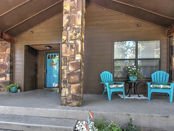 Relax on your large covered porch of this 3 bedroom 2 bath home with circular driveway and oversized lot with mature trees. Large vaulted living room with wood burning fireplace. Adorable kitchen with breakfast bar, nook and 2 pantries! split floorplan. Oversized rear entry garage with tons of storage. Newer heat/air and newer roof, New carpet. Security system. Storm cellar. Covered patio with shiplap cedar wall. Peaceful backyard with large covered patio and mature trees. Realtor related to seller.