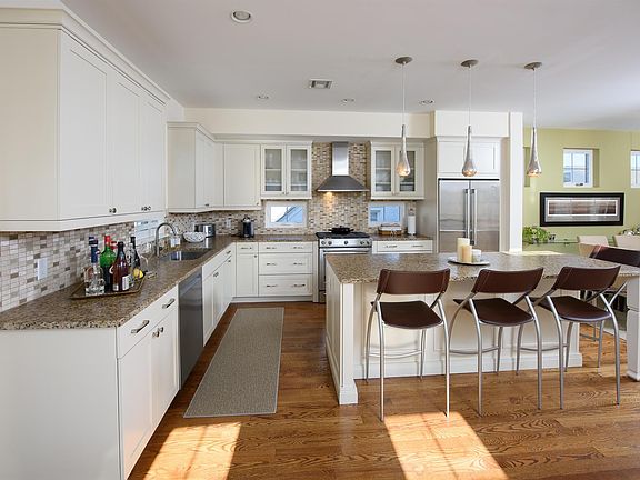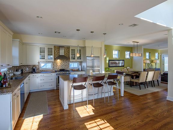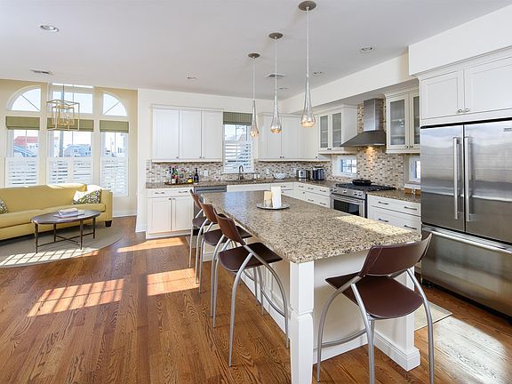 3214 Pacific is a three bedroom, two and one half bath home, just a couple houses from the beach and is truly a Longport gem. The "upside down" open layout is flooded with natural light and air. The first floor has two guest bedrooms, each with their own access to the back yard patio. A hallway full bath, with a tiled stall shower and frame-less glass shower door accommodates the two guest bedrooms. There is also a full utility room that has a tankless Rinnai water heater, a Simon XT security system and Samsung front loading washer and dryer. Oak hardwood floors lead to the three story open landing staircase. The second floor great room has a center island kitchen that comfortably seats four on its expansive granite countertop. The stainless steel appliance package includes a Viking french door refrigerator, gas range with a self cleaning oven and a KitchenAid dishwasher. Generous granite countertops and abundant custom cabinets provide all the storage needed for the home chef. There is a cozy seating nook next to the kitchen for guests to enjoy. A large dining area separates the kitchen from the spacious living room with its gas log fireplace and access to the outside deck. A marble vanity powder room is just off the living room. The Master Suite is on the entire third floor. Panoramic ocean views fill the windows of the master bedroom with its own private deck. An earth tone tile and granite master bath has twin sinks, a corner soaking tub and a huge stall shower.