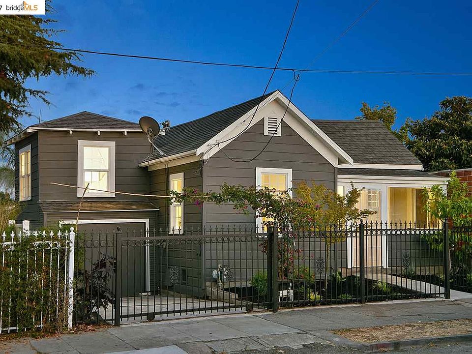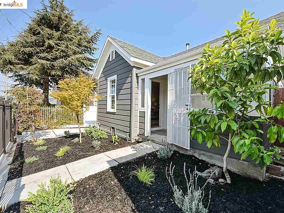 Set at the top of a hill, this winsome 1910 cottage has a charming street presence and is full of cozy details inside. Behind a wrought iron fence, the front yard is accented with bougainvillea, maple and magnolia. Square pavers lead up to a glassed-enclosed porch, which works as a sunny foyer. It's a lovely, quiet spot to sit and enjoy the garden. Inside, the open floor plan makes the most of the space. The living room has light from tall windows and warm hardwood floors leading into the dining area. A large full bathroom is off the living room. Though in the back, the kitchen is the heart of this home. Granite graces the counters and island. White cabinets with glass doors create a traditional look; a stainless steel sink and matching appliances make it feel modern. Best of all, the window over the sink frames a lovely view of the Oakland hills. Spend the day enjoying the delights of Oakland's neighborhoods, and come home to savor the view of twinkling lights in the hills.