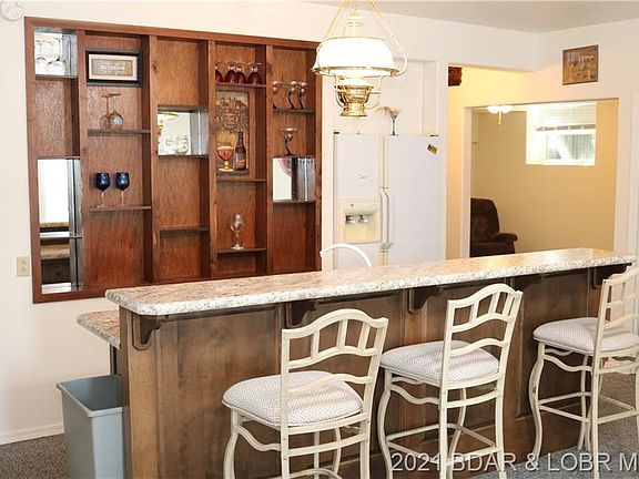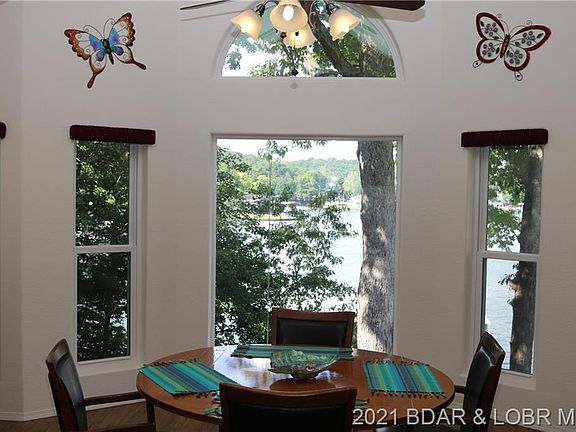 Delightful 1 owner quality custom made lakefront retreat. Perfect O road location. Ideal gentle lakefront in deep water cove with good protection nice view, good year round water depth. Excellent light and bright open floor plan with all living on the main level. Generous glass to enjoy the beautiful setting and view. Plenty of space for family and guest to spread out on the lower level. The lower level has large wet bar that could easily be converted to separate kitchen as well. This property consist of main home being aprox 3100 square feet and the huge detached garage, guest house complex offers 1000 square feet of self contained living space Rv garage 12x12 doors, lots of possibility's for rental income or large family complex. This property has an awesome peaceful quiet setting with large shade trees and great gentle lakefront in superior protected cove lots of paved parking, golf cart path to waters edge, Gravois arm sewer district Come enjoy this freedom property with no HOA