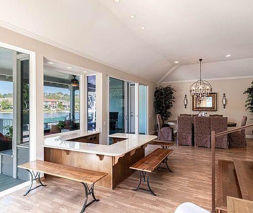 Rare 1 story furnished Oakshore main channel residence on manned guard gated Westlake Island with breathtaking lake and mountain views. 2 bedroom, 1 with Murphy Bed and den area. Late 90's remodel and additional remodeling in 2006 and 2020. Laundry room converted to office work area. Extra large wrap around deck perfect for entertaining. Private boat dock. Additional storage in garage including pull down ladder.
