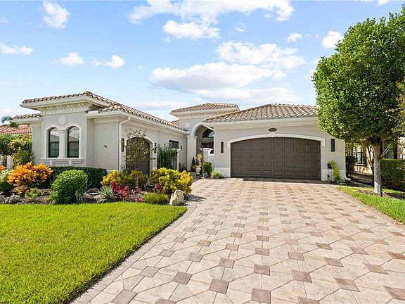 Located in the luxurious Riverstone community in the heart of North Naples, this gorgeous Carlyle model is situated on a beautiful unique lake lot with long, breathtaking views and prime southwest exposure.. Featuring 3 bedrooms and 3 and 1/2 baths with clubroom, model view kitchen, hurricane impact windows and doors, hurricane shutters and power roll down hurricane screen on back Lanai. A split 3 car garage, central vacuum, upgraded cabinets throughout, large master shower, epoxy garage floors, wet bar with wine cooler, crown molding and upgraded finishes throughout, counter to ceiling mirrors, custom walk in closets, Long lake views, Pool with electric and solor heating with extended lanai. Riverstone is a prime community with a state of the art clubhouse with fitness center, indoor and outdoor basketball courts, resort style pool with cabana's and lap pool. Close to Naples beaches, entertainment and shopping.