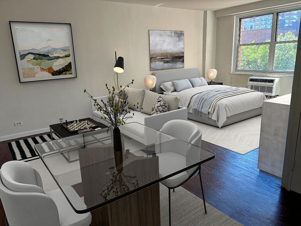 Sunny & Spacious Studio Full-Service Building This sunny and spacious studio is located in a full-service (24-hour Doorman) building with a live-in Superintendent and on-site management office. The studio features a separate kitchen with ample counter space. There are three generous closets, as well as a linen closet and an alcove for private dressing. The apartment facing south is flooded with natural light. This building has a common courtyard, a resident superintendent, a central laundry facility, bike storage, and swimming pool access with the affiliated Phillip Howard building. There are a wide variety of transportation options, including the No. 2 and 5 trains and the Manhattan express bus are in close proximity . The associate fees include rent, as listed, and security deposit equal to one month's rent. Utilities include heat, cooking gas, and hot water . Application and credit fees: $20 per applicant. The management application fee is $475.00, and there is a refundable move-in fee of $500.00. The apartment furniture has been virtually staged.