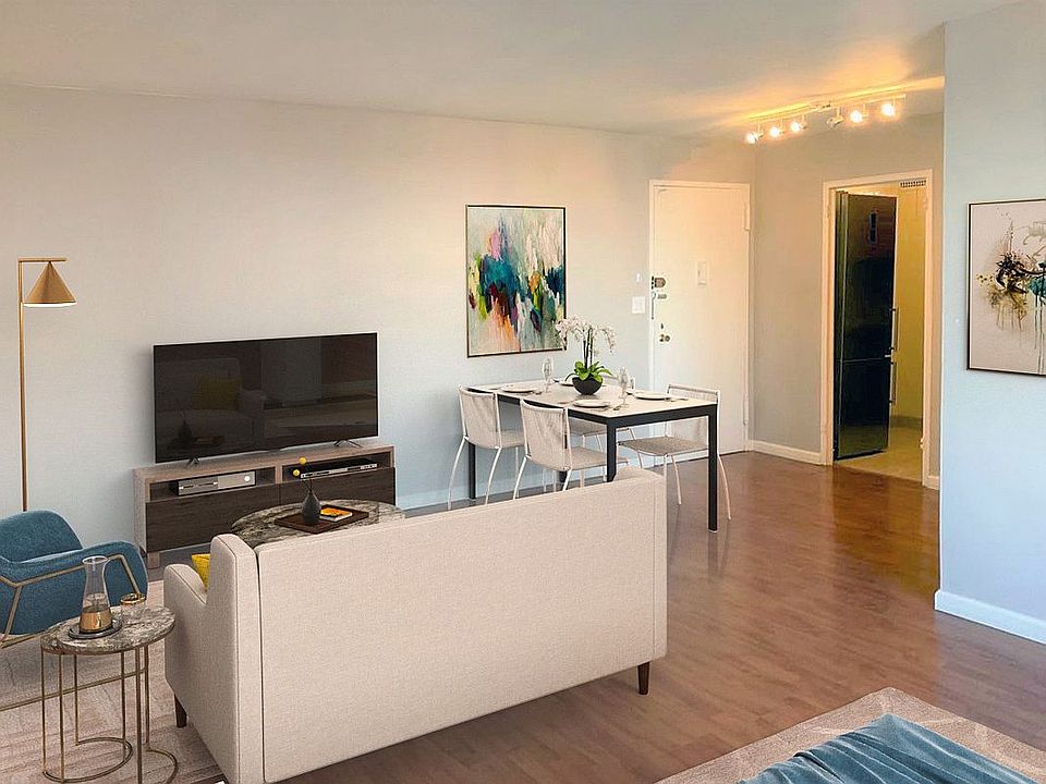 This studio is located on the top floor of a full-service building. The studio features a kitchen with ample counter space, a dishwasher and stainless-steel appliances. A unique and modern bathroom décor with a walk in shower is designed with high-end Carrara marble and brushed nickel features. There is plenty of closet space and the apartment facing south is flooded with natural light. Please note the studio living space is virtually staged. Located in Flatbush near Brooklyn College, this building has no flip tax, 24-hour doorman, parking garage (currently a waitlist), common courtyard, a resident superintendent, central laundry facility, bike storage, and swimming pool access with the affiliated Phillip Howard building steps away. Subletting is allowed after two years. The lobby has recently been remodeled and new elevators have just been installed. Everyday retail/shopping is within a close distance including Target, and Home Goods. Aldi Grocery Store is opening in the Fall. Lastly, there are a wide variety of transportation options including the 2, 5, B, and Q trains and Manhattan express bus, all in close proximity. Sorry no pets.