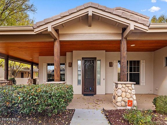 Welcome to this amazing single-level home in the highly sought-after Crossings at Willow Creek, a neighborhood that embodies luxury and tranquility. Set on just under an acre, this property is a masterpiece of design both inside and out with mature trees, artfully crafted rock walls, raised garden beds, and a lush private fully fenced backyard. The charming front porch sets the tone for the warm and inviting ambiance of this home. Step inside to discover an entertainer's dream where the great room features an open concept layout, centered around a breathtaking floor-to-ceiling rock hearth gas fireplace. The kitchen is a culinary showpiece boasting gleaming granite countertops and a massive island with seating for 8-10 guests along a plethora of knotty alder cabinetry with crown molding.