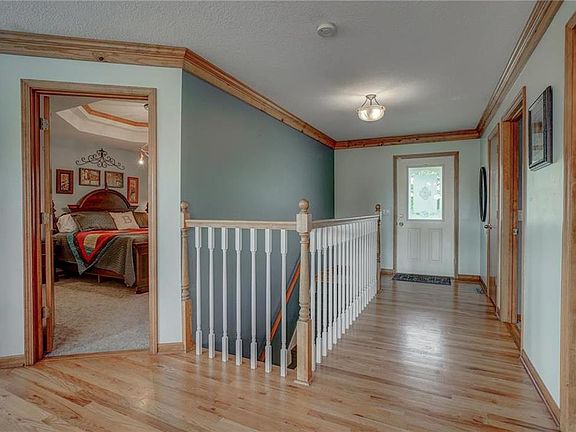 Serene reverse ranch home on approx. 4 Acres with orchard! As you walk inside, you will notice the open floor plan and the great room surrounded by floor-to-ceiling windows overlooking the picturesque property. The eat-in kitchen includes beautiful hardwood floors, custom cabinets, tile backsplash and a dining area with deck access. The master suite has vaulted ceilings and a large walk-in closet. The finished walk-out basement features a bedroom, full bathroom with double vanity and studio suite with kitchenette.