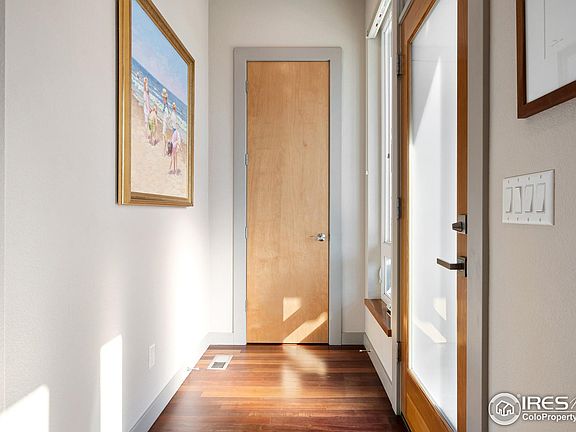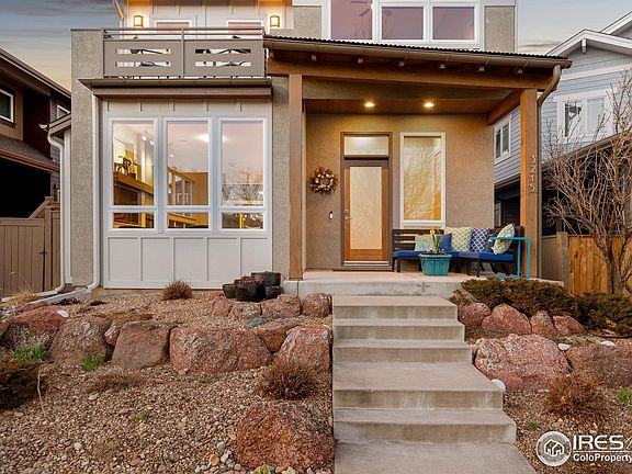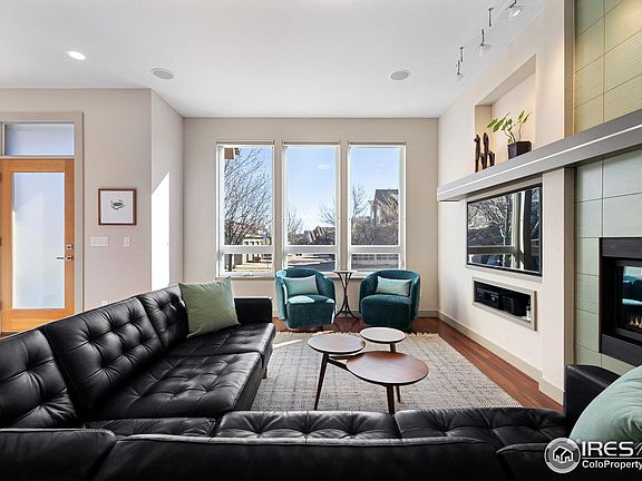 Stunning south-facing views unfold from this custom Northfield Commons home. Gorgeous Brazilian cherry hardwood floors cascade throughout an open-concept layout showcasing high-end upgrades. Abundant natural light streams in through vast, south-facing windows showcasing breathtaking views of the Flatirons. The home chef delights in a gourmet kitchen equipped with a new island, quartz countertops, cherry cabinetry and Thermador and KitchenAid appliances. Sliding glass doors in the dining area open to a private, fully-enclosed courtyard with an outdoor fireplace. Enjoy relaxing in a living room featuring oversized picture windows, a gas fireplace, and surround sound system. A staircase with custom metal railing ascends to the upper level where sizable bedrooms await with walk-in closets. The primary suite offers a luxurious escape with a private deck, dual-sided fireplace and a 5-piece bath with radiant in-floor heating and a jetted tub. Downstairs, a finished basement flaunts a theater room with surround sound. The 10 foot garage door and extra high garage are perfect for even the tallest Sprinter vans.