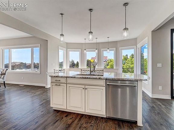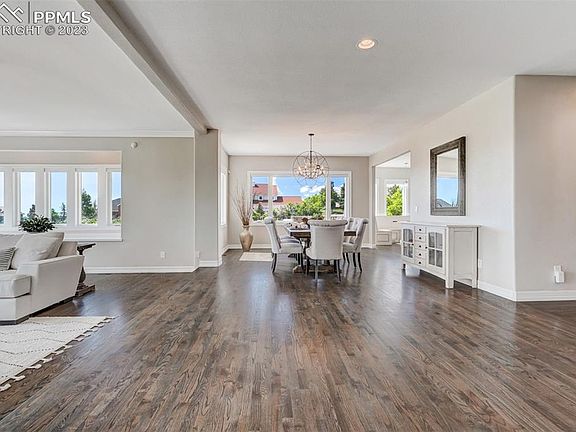 Entertainers dream home in upper Peregrine /Talon Ridge. Private almost 1.5 Acre lot with stunning views of Peregrine, Blodgett Peak, city lights & lot backs to open space. Open floor plan that extends through the entire main-level with formal living room, formal dining room, eat in kitchen & beautiful large great room with stone fireplace & new panoramic sliding door that leads out to incredible steel framed rear Trex deck. Spectacular views from the deck & natural surroundings that will make you not want to leave! The updated kitchen includes custom cabinets, granite counter tops, a custom bench and table that matches the cabinets & Thermador appliances including; refrigerator, gas range top w/gridle, hood, double oven with one being convection, microwave drawer & dishwasher. This home boasts; beautiful real hardwood floors, ceramic tile, newer light fixtures & fans, newer hardware, taller trim baseboards, beautiful barn door, crown molding, & updated bathrooms. A closet has been added to the office on the main level that can be converted to a main level bedroom! There is a bidet toilet in the master bathroom with double vanity, 2 way gas fireplace from master bedroom to master bathroom. Dual zone heating & cooling with 2 new AC units in 2022 & new windows in 2021. Brand new carpet in basement in 2021, shutters upstairs and new cellular/honeycomb shades on main floor. Upper level laundry. Huge walkout basement with room for pool table/ping-pong table & 2 large bedrooms with 3/4 bath & an additional room that can be used for a workout room or storage. This home is a must see!