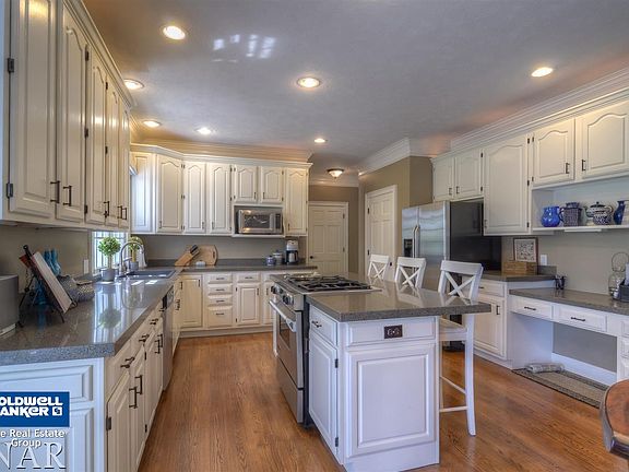 Absolutely gorgeous home. Main floor with triple crown molding and wood floors. Updated kitchen with white cabinets, granite countertops, center island eating bar, newer stainless appliances and pantry. Wet bar between kitchen and family room. Built in surround gas fireplace in large family room with many windows. Dining room with pillars. Living Room with pocket doors to Family Room. Master suite with trey ceiling, incredible bath with huge 2 sink vanity, travertine tile around whirlpool tub, walk in shower and large walk in closet. 4 large bedrooms, jack n jill bath. 5th bedroom used as office/bedroom. Walk out basement with L shaped family room/rec area, room used as bedroom and full bath. Heated side entry 3 car garage and epoxy floor. Fenced yard, trex deck with pergola. Gorgeous yard with many trees.