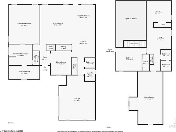 Custom home in the tucked away Cambron neighborhood in Spanish Fort. This 3 bed 2.5 bath home includes a bonus room (could easily be a 4th bedroom) and an upstairs den. Living room has soaring ceilings, los of natural light and overlooks backyard. Updated kitchen with granite counters, sea glass subway tile backsplash, pantry, eat-in breakfast area. Powder room located off kitchen for guests. Primary bedroom suite offers tray ceilings, and a luxurious bathroom with soaking tub, separate shower with glass door, dual vanities. Split bedroom plan. 2 stories. Tall ceilings. Upstairs contains the 2 guest bedrooms, small den which could be used as an office, and massive rec room. Plenty of room and storage! Laundry near kitchen. Large fenced backyard. Double car garage. Close to schools, shopping and dining. Both HVACs are NEW 2023. Water heater NEW 2022. HOA is $250/year. New fortified roof 2024. All information deemed reliable and accurate. Buyer to verify all information during due diligence.