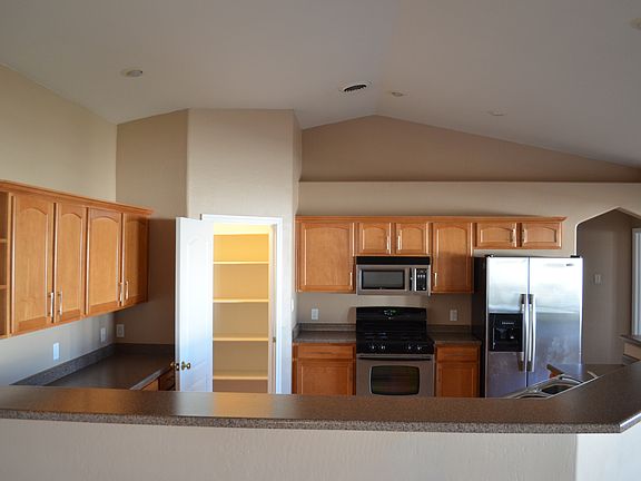 Beautiful pre-inspected home features vaulted ceilings over an open floor plan to host your gatherings. Recessed lighting, ceramic tile, bkfst bar, and a pantry highlight the kitchen. Jetted tub with separate shower, split bedroom arrangement, generous closets. Covered patio with view of the mountain peaks. Low maintenance front landscaping and a green lawn in the back yard round out this gem.