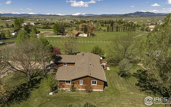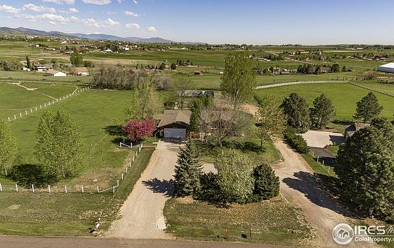 Welcome to your own little farm in beautiful Berthoud. This 2.12 acre lot has a 3 bed, 2 bath ranch home w/ a finished basement, an updated kitchen & a west facing sun room perfect for watching a sunset! Cozy up to the fireplace in the family room with gleaming hardwood floors. Step outside to find your own apple tree, clothes line, AMAZING mt views, & a 30x60 shop w/ concrete floors. The lean-to, corral & pasture are ready for your animals. Purchase water to irrigate from the HOA for $122/yr