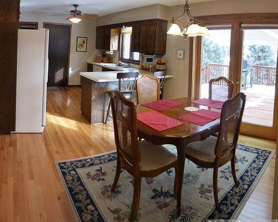 Beautiful walkout rambler in quiet, established neighborhood. The main floor features hardwood floors throughout and large windows for tons of natural lighting. Three spacious bedrooms all on the main floor, large eat-in kitchen and walkout to cedar deck. The lower level is recently updated with newer carpeting, fireplace, second kitchen and plenty of storage! Meticulously maintained and cared for! Hard to find 4 car garage!