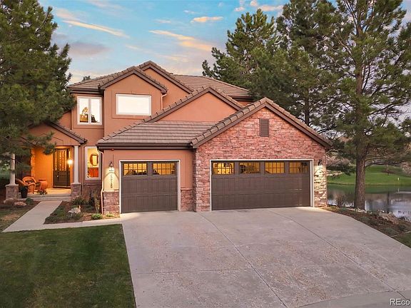 What's the most iconic image in Colorado? Mountains. What’s the most coveted feature on the Front Range? Water. Located on the 14th fairway of the private Country Club at Castle Pines, this gorgeous 2 bedroom | 3 bathroom home offers a larger than life surprise the second you walk in the door: unobstructed lake views. Fully updated inside with a back deck that makes you feel like you're in a waterfront lodge, this home is truly special. Perfectly positioned on a quiet cul-de-sac, this lock and leave residence is move-in ready and offers an additional 2,000 SF of unfinished basement space for expansion or storage. Interior highlights include engineered wood floors, extensive custom woodwork, stone accents, and an updated lighting system. Outside, you'll find a spacious stamped concrete patio with a fire pit, gas line, and professionally upgraded landscaping. Framed by arched stonework and rich hardwood floors, the striking foyer sets a sophisticated tone with a coffered ceiling and direct access to the living room, complete with vaulted ceilings with exposed wood beams. The kitchen features quartz counters, a farmer’s sink, gas range, double ovens, new refrigerator, and soft-close cabinetry. Showcasing a striking stone fireplace with custom mantel, the great room impresses, while a dedicated office offers wood detailing and glass French doors. The main level primary suite includes a second fireplace, deck access, and a spa-like bath with hammered copper sinks, alder cabinets, jetted tub, and custom walk-in closet. A sophisticated powder room includes a quartz vanity, grasscloth ceiling detail, and designer fixtures. Finishing the main level are a spacious mudroom | laundry room and a 3-car garage with epoxy-sealed floors. Upstairs, a versatile loft (easily converted to a 3rd bedroom) and guest suite with lake | mountain views share a full bathroom. With new windows, automated shades, and new HVAC, this home will make you feel like you're on vacation every single day.