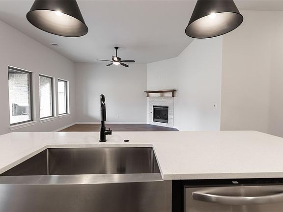 This Kamber floor plan includes 1,905 Sqft of total living space, which includes 1,750 Sqft of indoor living space & 155 Sqft of outdoor living space. This charismatic home offers 3 bedrooms, 2 full bathrooms, covered patios, a utility room, & a 2-car garage with a storm shelter installed. The living room presents high ceilings, a ceiling fan, wood-look tile, a corner gas fireplace surrounded by our elegant stacked stone detail, and 3 large windows. The high-end kitchen supports a large center island, stunning pendant lighting, custom-built cabinets to the ceiling, stainless steel appliances, decorative tile backsplash, 3 CM countertops, and a large walk-in pantry. The large primary suite spotlights a sloped ceiling detail with a ceiling fan, windows, & our cozy carpet finish. The prime bath offers a Jetta Whirlpool tub, a dual sink vanity, a walk-in shower, a private water closet, & a HUGE walk-in closet! The covered outdoor living supports a wood-burning fireplace, a gas line, & a TV hookup. Other amenities include our healthy home technology, a tankless water heater, R-44 insulation, a whole home air filtration system, & so much more!