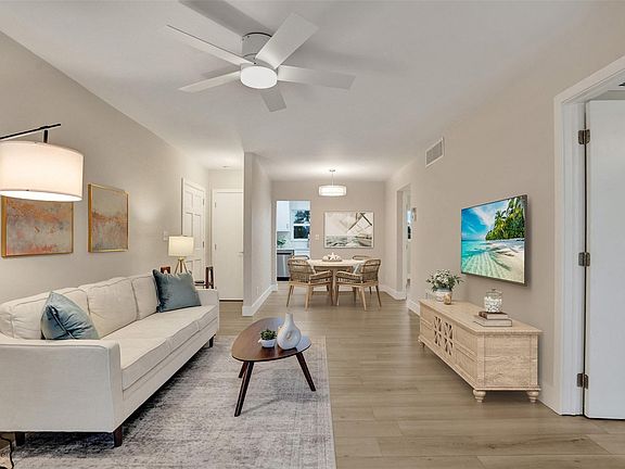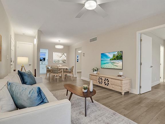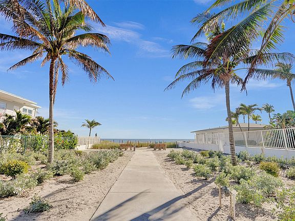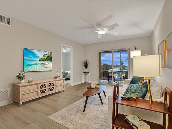 Renovated beach condo in a quiet residential neighborhood. This amazing top floor condo has NO SHARED WALLS except the floor as there is a unit beneath. Brand new renovation w/new impact windows & sliders, kitchen w/new white shaker cabinetry, granite counters/full backsplash, stainless appliances, new flooring in all living areas, kitchen & bedrooms, new light fixtures. Large baseboards throughout really highlight the beautiful paint color. The large primary bedroom has an enormous walk-in-closet. Screened in patio w/new tile floors. It's truly stunning! This condo overlooks the pool & has on-site storage, bike/beach chair room & laundry room. Close to the beach, restaurants, shopping, golf, pickleball, dog park, amphitheatre, playground, & aquatic center! .8 miles to the Fishing Village.
