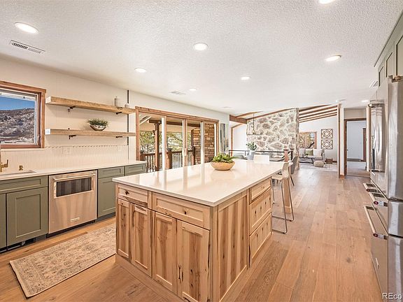 This equestrian retreat is perfectly, and privately, situated on 5 acres. Every inch has been extensively and impeccably renovated using high quality materials and superior craftsmanship. Notice the custom handrail and gorgeous rough-hewn stairs from the dramatic foyer. Host family and friends in the well appointed kitchen with a custom rangehood and vast island. The 11’ sliding door calls you out to view epic sunsets over Pikes Peak National Forest, Roxborough State Park, Longs Peak and the valley below.