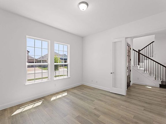 Discover seamless living and entertaining with the Kirby plan by UnionMain Homes. The Kirby is a beautifully open floorplan featuring a large kitchen with island overlooking the family room and a first-floor flex space or home office. The secluded primary suite features a luxe tray ceiling and oversized windows. The spacious primary bathroom features double vanities, an enclosed toilet, and a giant walk in closet. A convenient storage closet is located underneath the staircase that transitions into an enormous game room with views of below and optional built in bay seating. Included upstairs are three bedrooms that share a dual-vanity bathroom, and optional third bathroom. Additional highlights include an optional first floor guest suite, 2 cozy fireplace options, breakfast nook, and optional 3 car garage.