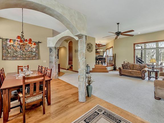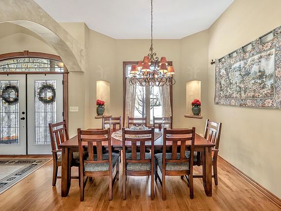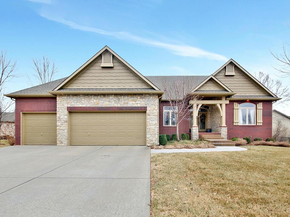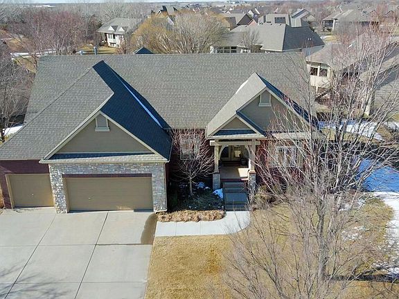 Stunning 5BR with large home office in the highly sought-after community of Fox Ridge. Maize schools. This award-winning former model has it all-formal and informal dining, split plan, hickory wood floors, beams, wine cellar and an incredible lower level. The home has captivating curb appeal, .43 acre lot and neighborhood amenities include two pools (one is lifeguarded), baby pool, playground and winding walking paths. Entering the home you are greeted with double leaded glass front doors, stone columns flanking the formal dining room, several designer niches and 11 ft ceilings. Living room and formal dining have an open feel, with enough room for your family table and entertaining. Abundance of light through windows with transom above, neutral colors and the grandness of an executive home create a great first impression. Master bedroom features a double tray ceiling with lighting, windows to your treed back yard and celestial windows. Master bath has double sinks, granite counters, jetted tub, water closet, walk-in shower, prep area and great storage. Master closet has seasonal rods and has been thoughtfully designed for maximum storage. The chef's kitchen has granite counters, stainless appliances, walk-in pantry, island with eating bar, hickory floors and a custom pot rack that is one of a kind. The informal dining room also has room for a larger table and has sliders to the covered deck. Hearth has a stone fireplace, more gorgeous windows and a vaulted ceiling with dramatic beams. Main floor laundry is a separate room (12'1 x 6'3) with sink, tile floors and additional storage. The remainder of the main level features two large bedrooms, full bath with granite counters and tile floor, a desk and a drop zone. Throughout the main level is stunning wood work that creates a warm elegance and this carries into the finished basement. Basement family room has walk out, 10' ceilings, wood column/stone/granite fireplace, built-in entertainment cabinet and view out windows with elaborate woodwork. Basement wet bar has dishwasher, kitchen-sized cabinets and counter area, space for a full-sized refrigerator and stamped concrete floors. Elaborate iron doors adjacent to the wet bar lead to the wine cellar and additional storage with built-in shelves. Basement also has rec room area that would be great for billiards, game room or play area. Two oversized bedrooms (one with walk in closet), full bath and an office with with French doors make up the remainder of this incredible basement. (Basement office could also be a 6th bedroom). Whole home surround sound, mature trees, meticulous landscaping and the yard is on sprinkler and well. Location is convenient to Eisenhower airport, highways, hospitals and shopping at New Market Square and there is a walking path to Maize South schools. Don't miss this home-schedule a showing today!