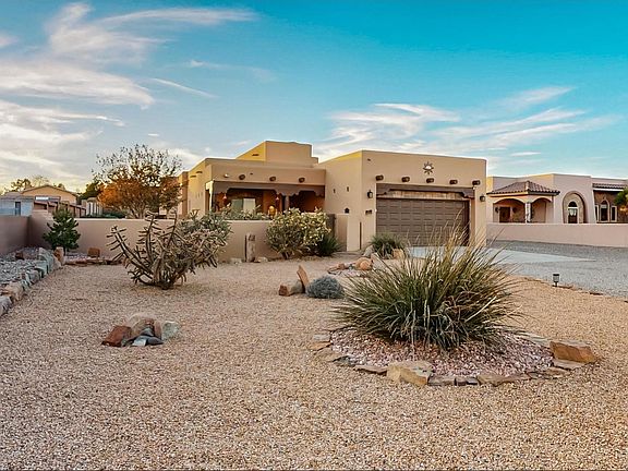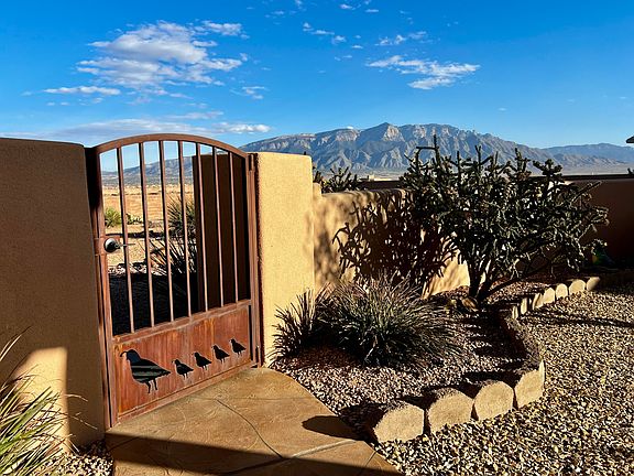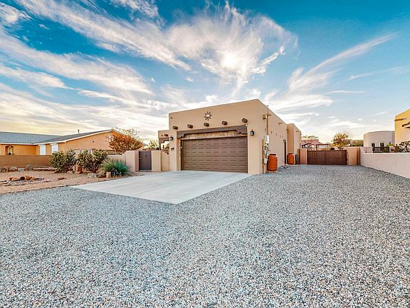 Beautiful North Rio Rancho home is THE total package! Custom Pueblo style home w/traditional NM architectural features. Open floor plan in main living space plus a second living area. Enjoy raised ceilings w/herringbone patterned tongue & groove wood accents, vigas, wood flooring, stunning gas log kiva fireplace & nichos in main living area. Gourmet kitchen w/granite countertops & tilework that compliment custom alder cabinetry and high-end appliances. Tons of storage throughout the home. Primary suite features a huge walk-in closet, en suite w/ double sinks, separate soaking tub & step-in snail shower. OWNED SOLAR (2023), TPO roof installed 2023, electric hot water heater (NEW 2024), recirculating hot water system. Owned water softener. Workbench in oversized garage. Fully landscaped...