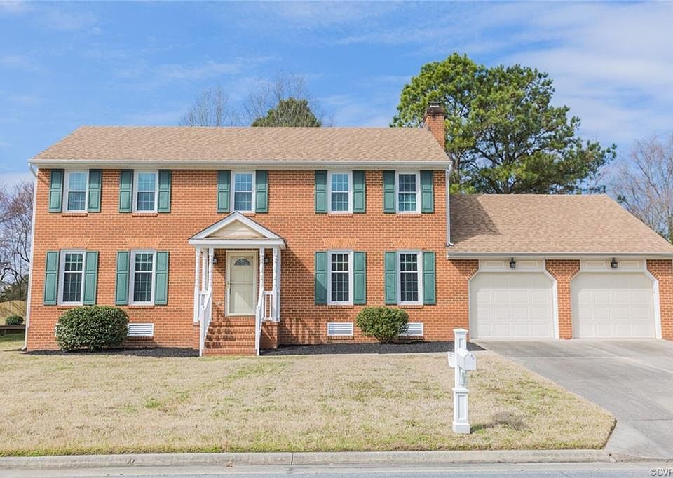 You will love this beautiful well maintained brick colonial, located on a CUL-DE-SAC lot. This 4-bedroom, 2 1/2-bathroom home has an over-sized 2-car garage-- giving you 2,400 sq. ft. Bright living room w/french doors, FORMAL DINING w/chair rail, and generous sized eat-in kitchen including STAINLESS appliances. Cuddle up next to a WOOD BURNING FIREPLACE in a sizable family room w/wood beams and brand new carpet; open to the Bonus SUNROOM with french doors. Entire 2nd level has brand NEW carpet. Boasts four spacious bedrooms; an over-sized Master suite w/large walk in closet, master bath, and dressing table. Ceiling fans/lighting throughout the entire home. Brick and vinyl exterior including vinyl columns & railing on the front porch, as well as a very LARGE rear DECK with low maintenance vinyl decking and railings; making the exterior practically maintenance free. All of this situated in a convenient, friendly neighborhood. You do not want to miss out on this fantastic home in the North Elementary district. Plenty of shopping nearby, including the new Publix. Easy access to 95 & 288. (15 minutes to Ft. Lee MEPS and 30 minutes to downtown Richmond)