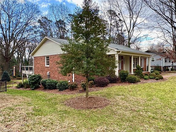 Charming traditional High Point home on beautifully landscaped lot invites you to settle in for enjoyment year round! Inside, you'll love the spacious, welcoming feel of the main living areas which offer a bit of definition but fabulous flow for entertaining & everyday comfort living. Gorgeous replacement windows w/ custom plantation shutters showcase stunning views and natural light. Kitchen & bath cabinetry updated from original; solid surface counters & blt-in breakfast island plus gleaming white appliances in the sunny kitchen remain. Enjoy the warmth of 2 brick FP's-1 tucked in the cozy den (gas logs) & a 2nd in the full unfin. daylight bsmt. Chair lift system installed in 2023 to access bsmt./garage; 2 insulated garage doors & plenty of bsmt. room for ALL your gaming, DIY projects, storage or dreams for expansion. Full brick exterior; generously sized front porch; composite wood rear decking; Hunter Pro sprinkler system. Well loved & well maintained by only 1 family!