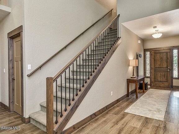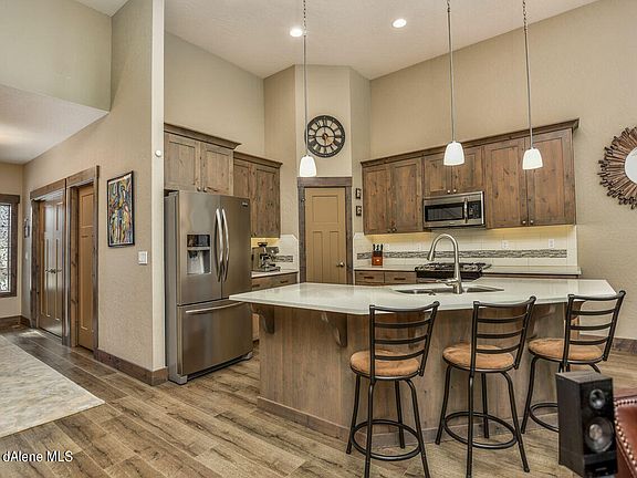 This luxurious one owner home is the epitome of the Spring Creek community. Model home, 4 bed /3.5 bath with maxed out upgrades, nestled around Schweitzer Mtn with unobstructed views. A single level home with an above garage bonus ensuite. Enter through the timber framed foyer to a home filled with modern tech, like nest thermostat & humidifier, doorbell, WIFI light switches & WIFI weather controlled 6 zone sprinklers. 13' ceilings in the great room and an exquisite custom fireplace w/mantle. Backs up to a community area and the creek, buffer to any future development. 42'' alder kitchen cabinets with LED lighting, soft-close cabinets throughout, quartz counters and matching stainless appliances. Covered patio with 13' ceilings and a gas supply. 3 car garage with built-in storage. Fiber internet. Vinyl fencing with post lights and 5 fruit trees. Centrally located to schools, stores and recreation and a 15 min bike ride away from the city beach via dedicated bike lanes and paved trails.